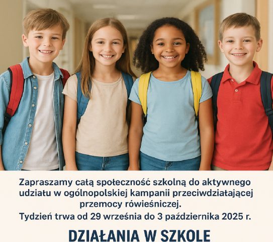 Nasza szkoła przystąpiła do Ogólnopolskiej Kampanii Ministerstwa Edukacji Narodowej Przeciwdziałającej Przemocy Rówieśniczej. Podczas tej kampanii w dniach od 29 września do 03 października 2025 roku został przygotowany Tydzień Przeciwdziałania Przemocy Rówieśniczej w ramach którego odbyły się apele profilaktyczne dla oddziałów IV-VIII. Prowadzącymi spotkania w dniach 30.09.2025 r. oraz 02.10.2025…