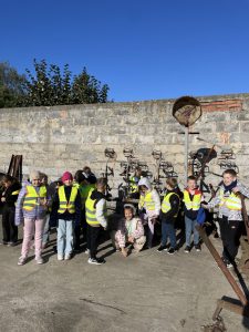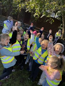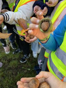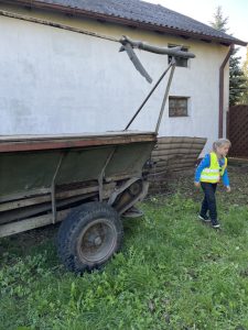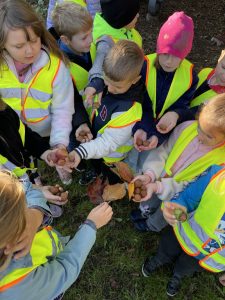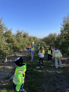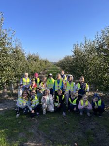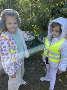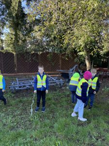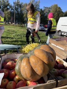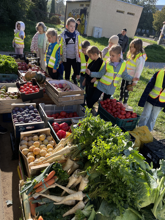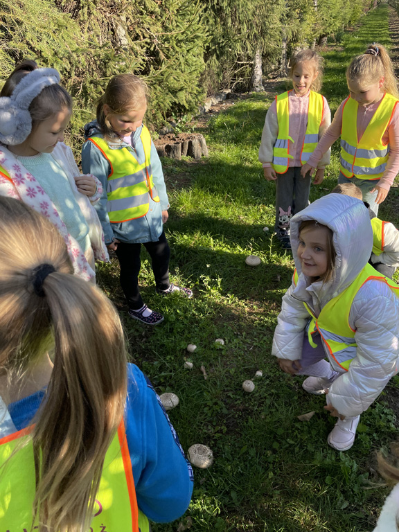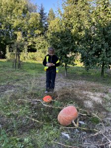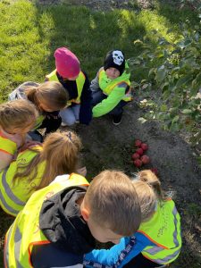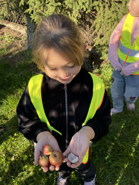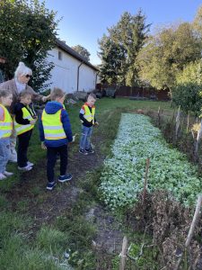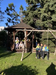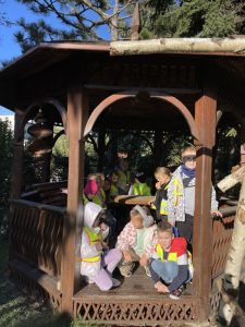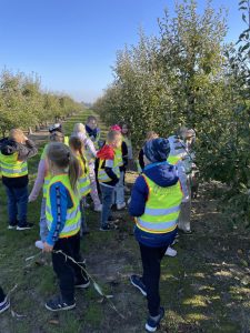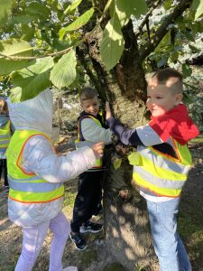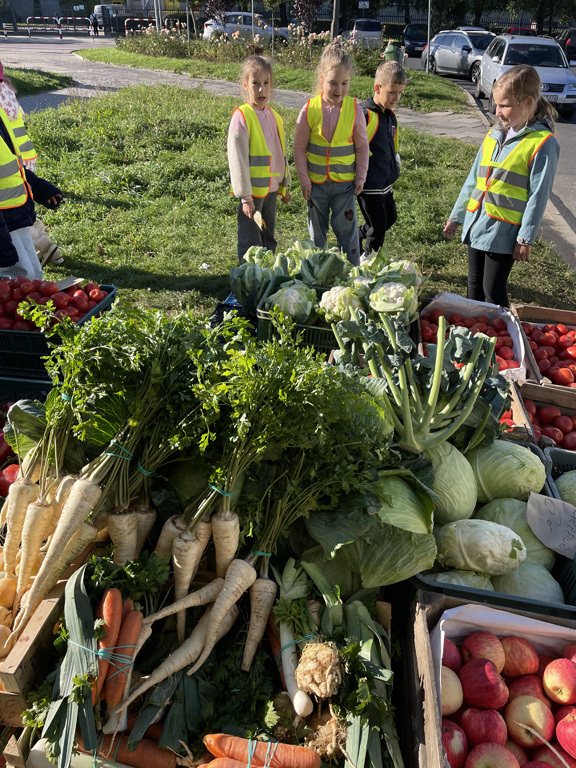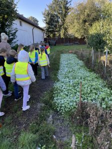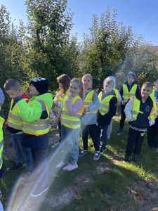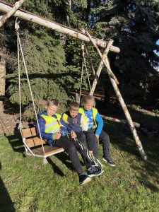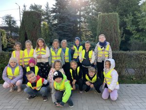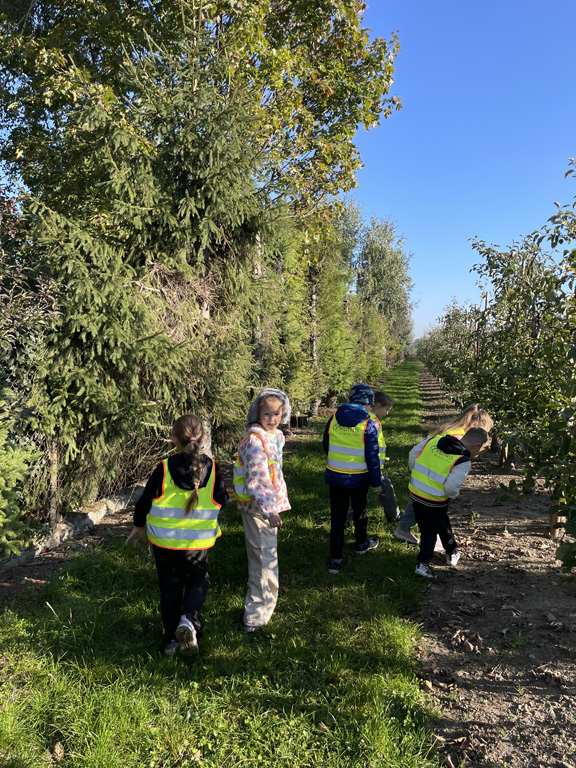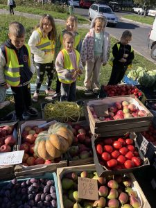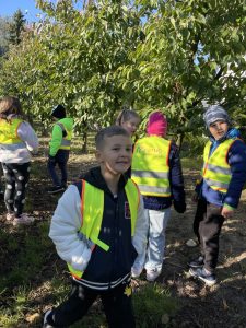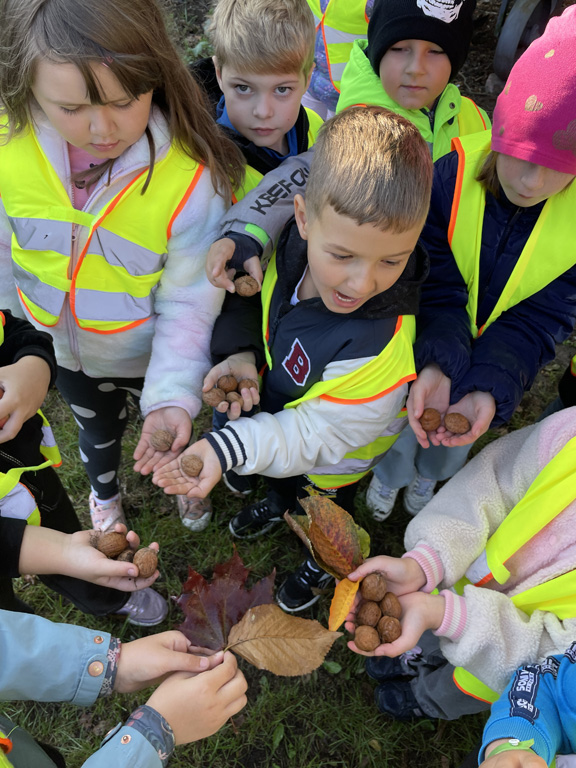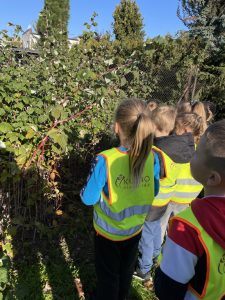 Jesień to piękna pora roku. By to zobaczyć,  opuściliśmy szkolne mury i uzbrojeni  w cierpliwość, z wyostrzonymi zmysłami wyruszyliśmy na ,,zieloną lekcję przyrody”  (a właściwe ,,złotą lekcję przyrody” ). Tym razem udaliśmy się do sadu i ogrodu. Nie widzi ten, kto nie patrzy. Nie słyszy ten, kto nie słucha. A my zobaczyliśmy piękną ,,złotą jesień”, usłyszeliśmy śpiew ptaków, obserwowaliśmy ptasie sejmiki… Nie na obrazku, ale  w rzeczywistości – tylko tak można zachwycić się i zrozumieć, jak niesamowita jest przyroda. Na takiej poglądowej lekcji, gdzie poznanie i utrwalanie dokonuje się przy udziale wszystkich zmysłów najłatwiej przyswaja się wiadomości. Słońce świeciło na złote i czerwone liście. Pod jabłonią znaleźliśmy spadające jabłka, a pod kasztanowcem mnóstwo błyszczących kasztanów. W mokrej od rosy trawie natknęliśmy się też na grzyby. W powietrzu unosiły się pajęczyny, a nad nami przelatywały chmury. Była to bardzo radosna, jesienna wycieczka. Kolorowa jesień to najlepsza pora roku na zbiory pysznych, zdrowych warzyw i owoców, które są źródłem wielu witamin. Podczas spaceru dowiedzieliśmy się jaka jest różnica między sadem a ogrodem. Oglądaliśmy drzewa i krzewy owocowe, warzywa i zioła. Rozpoznawaliśmy, nazywaliśmy i opisywaliśmy warzywa i owoce. Mieliśmy tez okazję zobaczyć niektóre narzędzia i maszyny wykorzystywane w pracach w sadzie i ogrodzie. Przed powrotem do szkoły kilka chwil spędziliśmy w rekreacyjnej części ogrodu. Nie sposób było się oprzeć pięknej altanie i huśtawce…