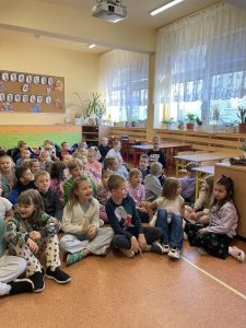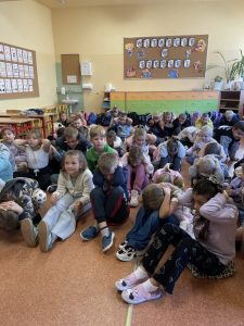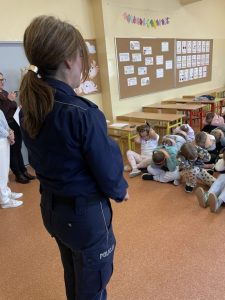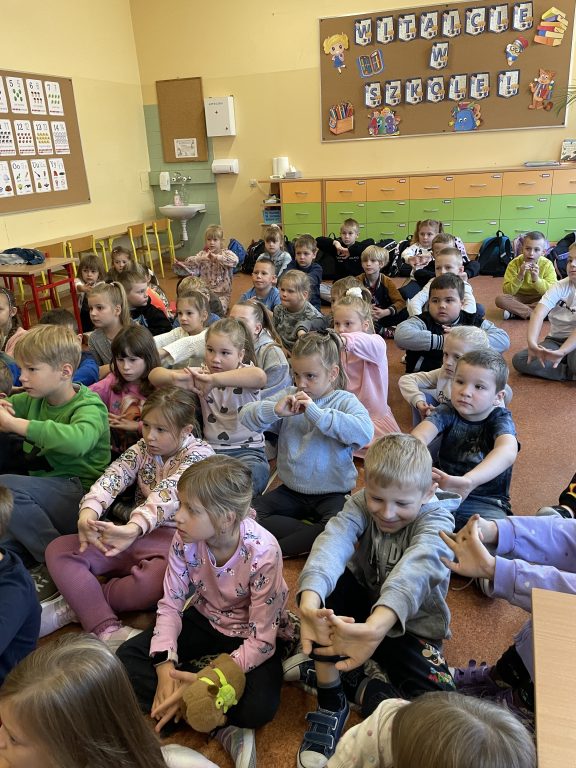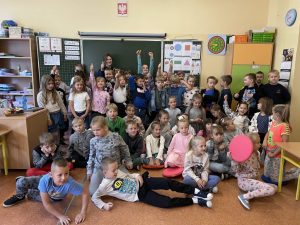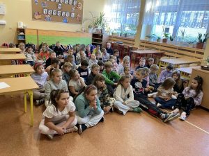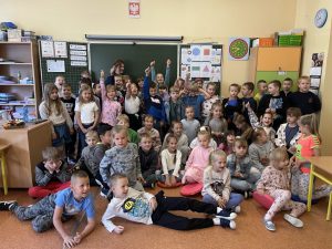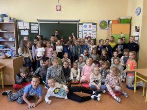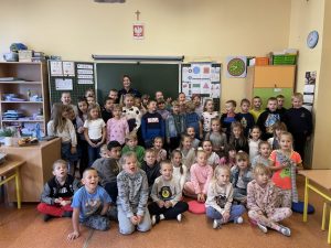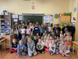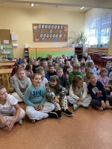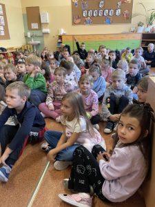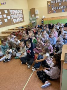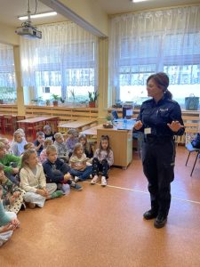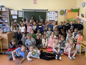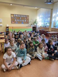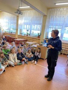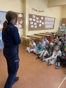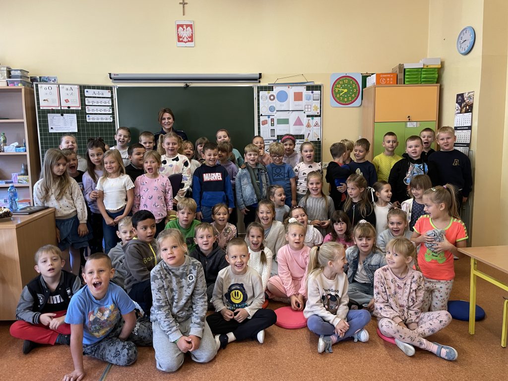 Dnia 26 września 2025 r. w ramach akcji „Bezpieczna droga do szkoły” odbyło się spotkanie uczniów klas pierwszych z wyjątkowym gościem  funkcjonariuszką Komendy Policji w Kutnie Katarzyną Wasiak.  Celem spotkania było przypomnienie zasad bezpieczeństwa w szkole i poza nią. Policjantka  rozmawiała z dziećmi o podstawowych zasadach bezpieczeństwa w ruchu drogowym, omówiła zasady prawidłowego przechodzenia przez przejścia dla pieszych. Podkreśliła  ważną rolę elementów odblaskowych, które każdy uczeń powinien posiadać. Przypomniała również zasady jakie należy stosować w kontaktach z obcymi. Ponadto funkcjonariuszka poruszyła temat zachowania ostrożności podczas przebywania samego dziecka w domu oraz cyberprzemocy i skutków, jakie może nieść za sobą niewłaściwe korzystanie z Internetu. Uczniowie mieli możliwość obejrzenia filmu edukacyjnego „Kamlotki”. Fachowe przeprowadzenie zajęć przez specjalistę w dużym stopniu przyczyniło się do wzrostu świadomości zachowań ryzykownych i bezpiecznych wśród uczniów. Mamy nadzieję, że pozytywnie wpłyną na ich zachowanie w szkole i poza nią. Zajęcia z przedstawicielką Policji są jednymi z wielu działań realizowanych w ramach programu wychowawczo – profilaktycznego naszej szkoły.