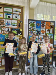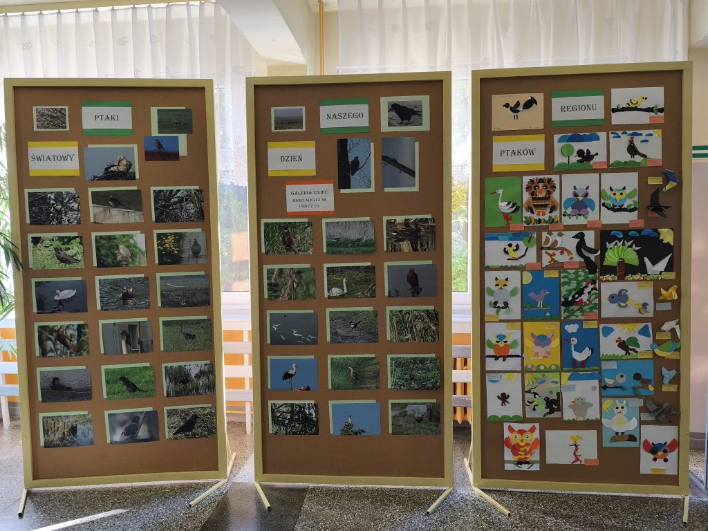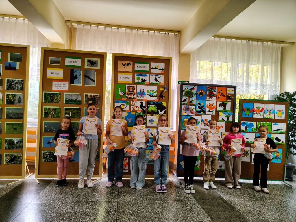 Jak co roku w październiku roku odbywa się Światowy Dzień Ptaków. Jego celem jest zwrócenie uwagi na potrzebę ochrony ptaków wraz z ich naturalnym środowiskiem. Z tej okazji uczniowie naszej szkoły mieli okazję obejrzenia wystawy pięknych zdjęć ptaków wykonanych przez panią Beatę – babcię dziewczynek – Alicji z IIIB i Niny z ID. Uczestniczyli w spotkaniu z ornitologiem – pasjonatem panem Andrzejem Żurawiczem, który zaprezentował dzieciom zwyczaje ptaków, ich siedliska lęgowe, sposoby poszukiwania pożywienia oraz zagrożenia na jakie są narażone. Aby uczcić święto i utrwalić wiedzę na temat skrzydlatych przyjaciół, dla uczniów klas I-III został zorganizowany konkurs origami „Ptaki naszego regionu”. Celem konkursu było zapoznanie dzieci z ptakami zamieszkującymi na naszym terenie, dostrzeganie uroku otaczającej przyrody i nabywanie umiejętności ukazania tego piękna za pomocą złożonych, papierowych kół lub kwadratów. Zaproponowana technika dążyła do rozwijania zamiłowania do sztuki origami, jako atrakcyjnej formy spędzania czasu wolnego, pobudzania wyobraźni geometrycznej, sprawności manualnej oraz koncentracji. Podczas zajęć edukacji technicznej, a także rodzinnych składanek, uczniowie wykonali indywidualne prace przedstawiające postacie wróbli, bocianów, gołębi, srok, kowalików, sikorek, gili, gawronów, sów i bażantów. Najciekawsze prace zostały wyeksponowane na tablicach głównego holu naszej szkoły. Podczas oceny komisja wzięła pod uwagę estetykę wykonania, trudność złożeń, dobór koloru i papieru, pomysłowość, oryginalność oraz zgodność z tematem. Konkurs spotkał się z dużym zainteresowaniem uczniów. Wpłynęło ponad 70 prac, z których 34 zostały wyróżnione. Wyróżnieni uczniowie zostali nagrodzeni dyplomami i drobnymi upominkami. Gratulujemy wszystkim dzieciom, które wzięły udział w konkursie. Gorąco zachęcamy do dalszego działania i życzymy nowych sukcesów. Dziękujemy uczniom, nauczycielom, rodzicom, pani Beacie Buchalskiej i panu Andrzejowi Żurawiczowi za aktywne włączenie się w obchody Światowego Dnia Ptaków.