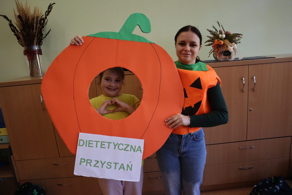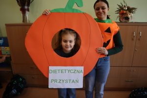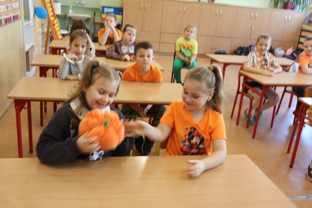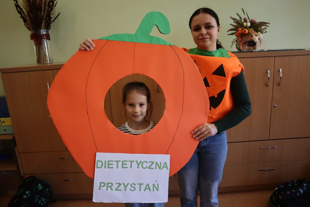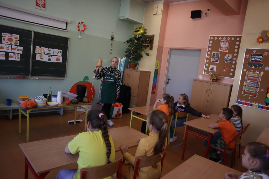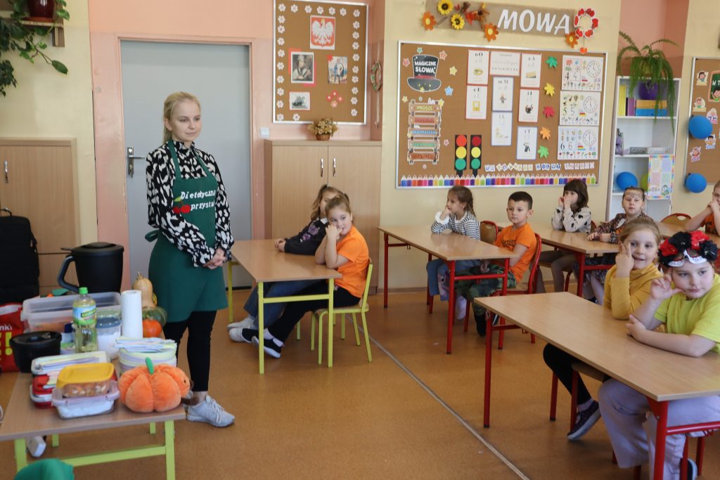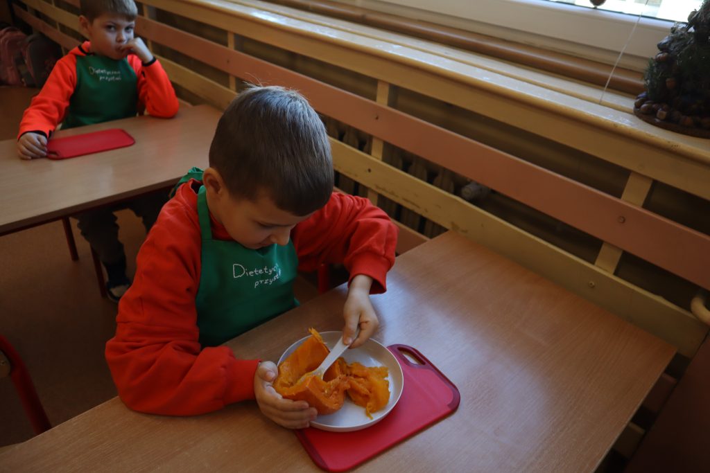 Dynia to bardzo zdrowe, urodziwe, wdzięczne i łatwe do współpracy warzywo. Październik jest idealnym miesiącem , by poznać ją bliżej. Znajduje ona zastosowanie w sztuce kulinarnej, ponieważ ma wiele wartości odżywczych, a także stała się pięknym elementem dekoracyjnym naszych domów, balkonów i ogrodów. Tak wszechstronne warzywo miało swoje “małe święto”  w oddziale 1c. To typowo jesienne święto obchodzone było po raz pierwszy  w naszym oddziale. W tym dniu sala 905 zamieniła się w dyniową krainę, w której królował kolor pomarańczowy oraz żółty.  W niezwykłej scenerii dzieci zostały powitane zabawną rymowanką „Dynia wita Was, na imprezkę czas ‘’. Na zajęciach gościliśmy dietetyka żywieniowego oraz edukatora  żywności z Dietetycznej Przystani. Celem spotkania było rozwijanie kreatywności, integracja, nauka o jesiennych warzywach, wspólna zabawa. Uczniowie rozmawiali na temat zdrowych owoców i warzyw oraz dowiedzieli się, które produkty nie są korzystne dla zdrowia. Pani dietetyk w ciekawy sposób zaprezentowała im, jak rośnie dynia, jakie są jej odmiany oraz jakie wartości odżywcze posiada. Poznali także wiele ciekawostek o dyni. Największym zainteresowaniem cieszyły się jednak dyniowe warsztaty kulinarne, których celem było wspólne przygotowywanie kopytek dyniowych. Dzieci z ogromnym zaangażowaniem i radością wykonywały zadania kulinarne, ucząc się przy tym samodzielności i współpracy. Dzięki tym zajęciom miały okazję nie tylko poznać różnorodność smaków  i możliwości kulinarnego wykorzystania dyni, ale także dowiedzieć się więcej o jej pozytywnym wpływie na zdrowie. Radość z własnoręcznie przygotowanego dania była równie duża, co apetyt na nie. Nawet najwięksi sceptycy uznali, że dynia jest super! Warsztaty pozwoliły uczestnikom nie tylko rozwinąć swoje umiejętności kulinarne, ale także docenić wartość tego wyjątkowego warzywa. Dynia zachwyca, inspiruje  i uczy – warto, by częściej gościła na naszych stołach. Nie zabrakło również zdjęć   w „fotobudce dyniowej”, które upamiętniły ten radosny dzień. Na zakończenie każde dziecko otrzymało dyplom uczestnictwa w dyniowych warsztatach kulinarnych oraz przepis na kopytka dyniowe. Dzień  był pełen wrażeń, nowych smaków i cennych informacji o zdrowym odżywianiu. Uczestnictwo w warsztatach kulinarnych pomogło dzieciom wzmocnić wiarę we własne siły oraz nauczyć się samodzielności. Dziękujemy Paniom z Dietetycznej Przystani za wspólnie spędzony czas.