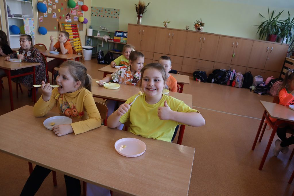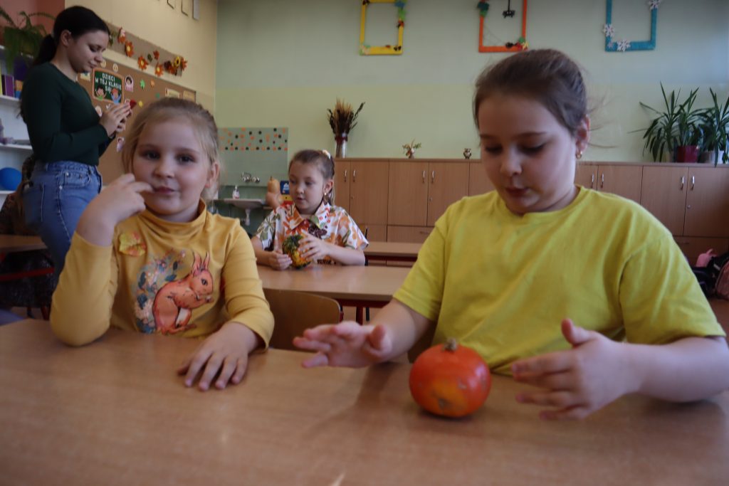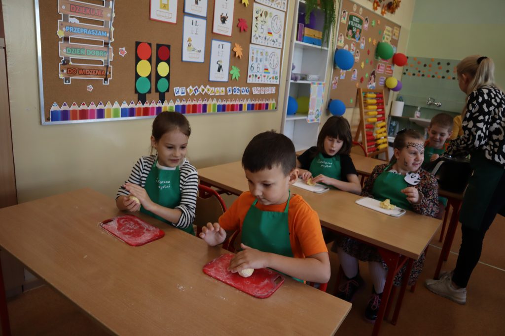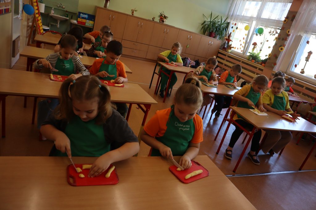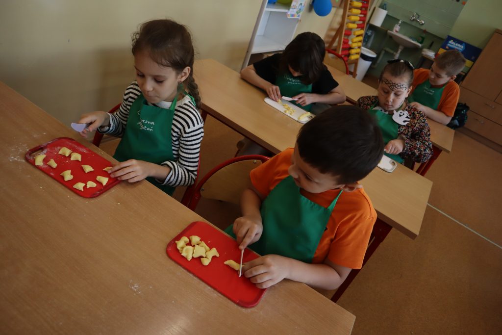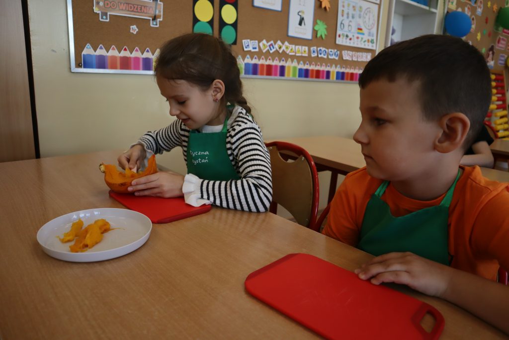 Dynia to bardzo zdrowe, urodziwe, wdzięczne i łatwe do współpracy warzywo. Październik jest idealnym miesiącem , by poznać ją bliżej. Znajduje ona zastosowanie w sztuce kulinarnej, ponieważ ma wiele wartości odżywczych, a także stała się pięknym elementem dekoracyjnym naszych domów, balkonów i ogrodów. Tak wszechstronne warzywo miało swoje “małe święto”  w oddziale 1c. To typowo jesienne święto obchodzone było po raz pierwszy  w naszym oddziale. W tym dniu sala 905 zamieniła się w dyniową krainę, w której królował kolor pomarańczowy oraz żółty.  W niezwykłej scenerii dzieci zostały powitane zabawną rymowanką „Dynia wita Was, na imprezkę czas ‘’. Na zajęciach gościliśmy dietetyka żywieniowego oraz edukatora  żywności z Dietetycznej Przystani. Celem spotkania było rozwijanie kreatywności, integracja, nauka o jesiennych warzywach, wspólna zabawa. Uczniowie rozmawiali na temat zdrowych owoców i warzyw oraz dowiedzieli się, które produkty nie są korzystne dla zdrowia. Pani dietetyk w ciekawy sposób zaprezentowała im, jak rośnie dynia, jakie są jej odmiany oraz jakie wartości odżywcze posiada. Poznali także wiele ciekawostek o dyni. Największym zainteresowaniem cieszyły się jednak dyniowe warsztaty kulinarne, których celem było wspólne przygotowywanie kopytek dyniowych. Dzieci z ogromnym zaangażowaniem i radością wykonywały zadania kulinarne, ucząc się przy tym samodzielności i współpracy. Dzięki tym zajęciom miały okazję nie tylko poznać różnorodność smaków  i możliwości kulinarnego wykorzystania dyni, ale także dowiedzieć się więcej o jej pozytywnym wpływie na zdrowie. Radość z własnoręcznie przygotowanego dania była równie duża, co apetyt na nie. Nawet najwięksi sceptycy uznali, że dynia jest super! Warsztaty pozwoliły uczestnikom nie tylko rozwinąć swoje umiejętności kulinarne, ale także docenić wartość tego wyjątkowego warzywa. Dynia zachwyca, inspiruje  i uczy – warto, by częściej gościła na naszych stołach. Nie zabrakło również zdjęć   w „fotobudce dyniowej”, które upamiętniły ten radosny dzień. Na zakończenie każde dziecko otrzymało dyplom uczestnictwa w dyniowych warsztatach kulinarnych oraz przepis na kopytka dyniowe. Dzień  był pełen wrażeń, nowych smaków i cennych informacji o zdrowym odżywianiu. Uczestnictwo w warsztatach kulinarnych pomogło dzieciom wzmocnić wiarę we własne siły oraz nauczyć się samodzielności. Dziękujemy Paniom z Dietetycznej Przystani za wspólnie spędzony czas.