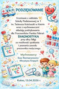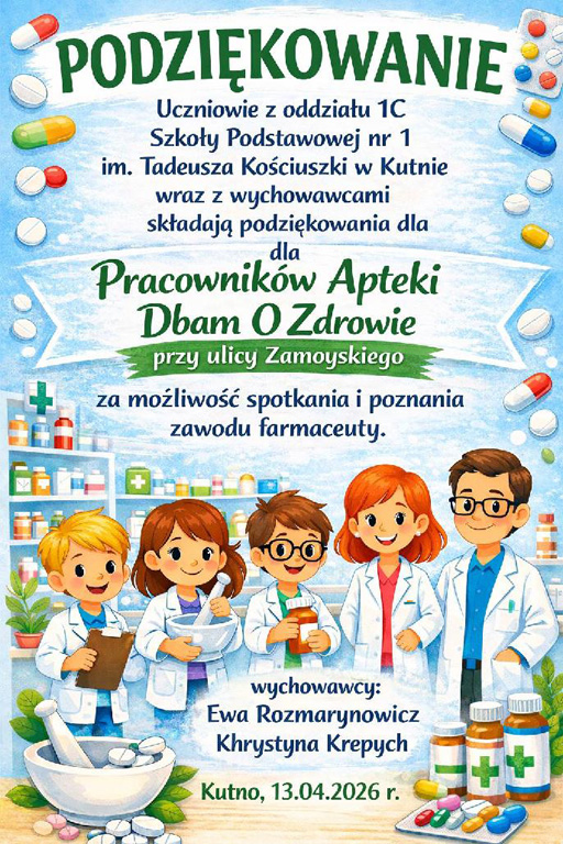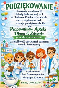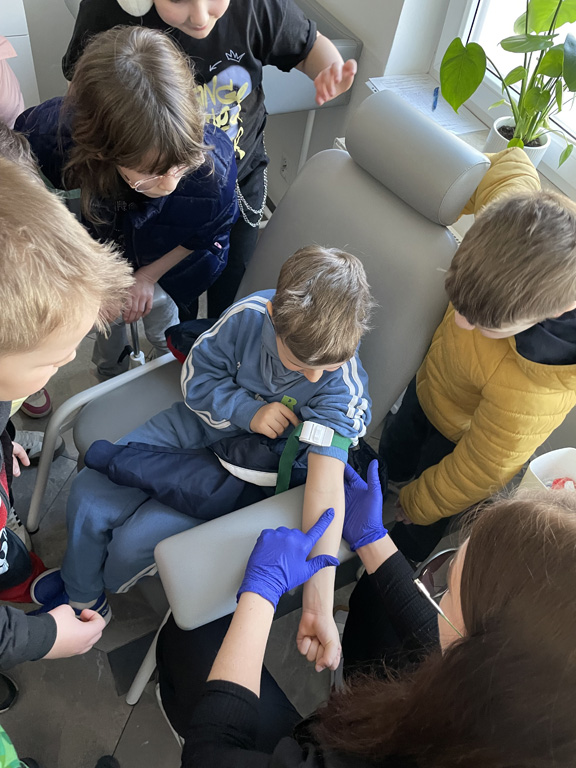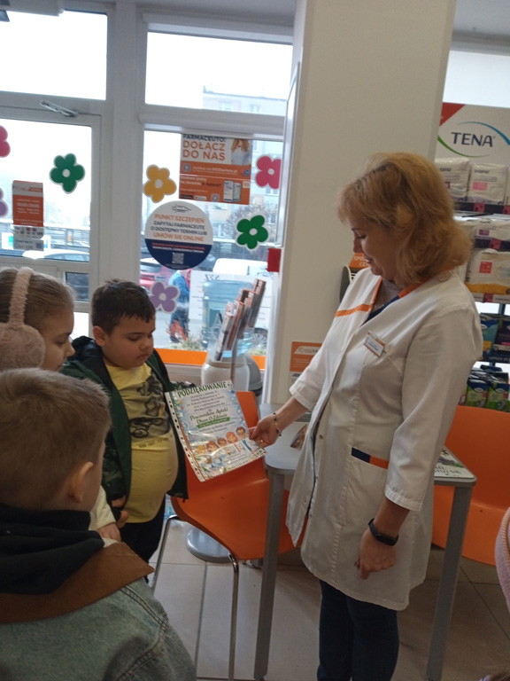 Wiemy już, że leki to nie cukierki, a antybiotyki  to nie lekarstwa na katar. Działają one bowiem tylko na bakterie, a przy wirusach (które najczęściej nas atakują) są bezużyteczne. Farmaceuta przekonał nas, że dużo lepsze jest naturalne wsparcie…. czosnek, imbir, miód to świetne ,,antybiotyki,, , które warto włączać do diety zanim sięgniemy po preparaty z apteki. No, a jeśli już kupimy w aptece jakiś lek, to należy  dokładnie zapoznać się z jego etykietą i datą ważności. Wiemy także, że badania  profilaktyczne są bardzo ważne, zwłaszcza w okresie przedwiośnia, gdy nasz organizm jest osłabiony. Powinniśmy, właśnie teraz, badać poziom witaminy D i żelaza,  bo ich niedobory to najczęstsza przyczyna szkolnego zmęczenia i braku koncentracji. Wizyta w Diagnostyce odczarowała również lęk przed igłą.